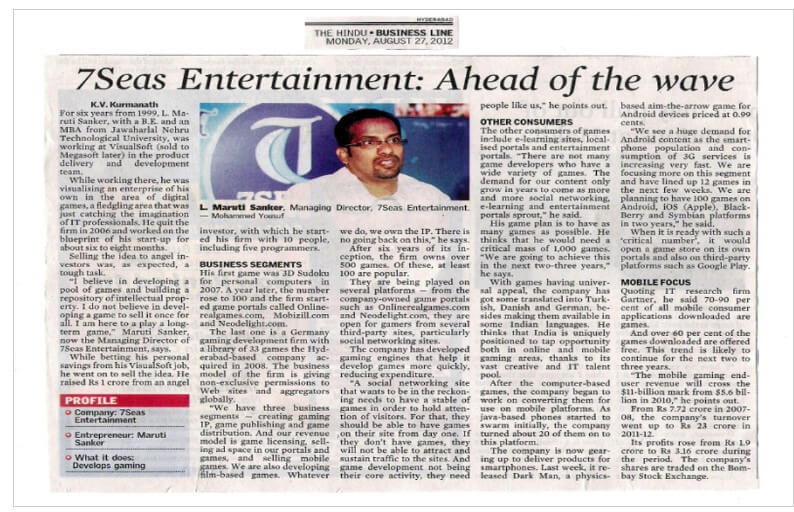 For six years from 1999, L. Maruti Shankar, with a B.E. and an MBA from Jawaharlal Nehru Technological University, was working at VisualSoft (sold to Megasoft later) in the product delivery and development team. While working there, he was visualising an enterprise of his own in the area of digital games, a fledgling area that was just catching the imagination of IT professionals. He quit the firm in 2006 and worked on the blueprint of his start-up for about six to eight months. Selling the idea to angel investors was, as expected, a tough task. "I believe in developing a pool of games and building a repository of intellectual property. I do not believe in developing a game to sell it once for all. I am here to play a long-term game," Maruti Shankar, now the Managing Director of 7Seas Entertainment, says. While betting his personal savings from his VisualSoft job, he went on to sell the idea. He raised ₹1 crore from an angel investor, with which he started his firm with 10 people, including five programmers. Other Consumers: The other consumers of games include e-learning sites, localised portals, and entertainment portals. "There are not many game developers who have a wide variety of games. The demand for our content will only grow in the years to come as more and more social networking, e-learning, and entertainment portals sprout," he says. His first game was 3D Sudoku for personal computers in 2007. A year later, the number rose to 100, and the firm started game portals called OnlineRealGames.com, Mobizill.com, and Neodelight.com. The last one is a German gaming development firm with a library of 33 games that the Hyderabad-based company acquired in 2008. The business model of the firm is giving non-exclusive permissions to websites and aggregators globally. "We have three business segments: creating gaming IP, game publishing, and game distribution. And our revenue model is game licensing, selling ad space in our portals and games, and selling mobile games. We are also developing film-based games. Whatever we do, we own the IP. There is no going back on this," he says. - Article